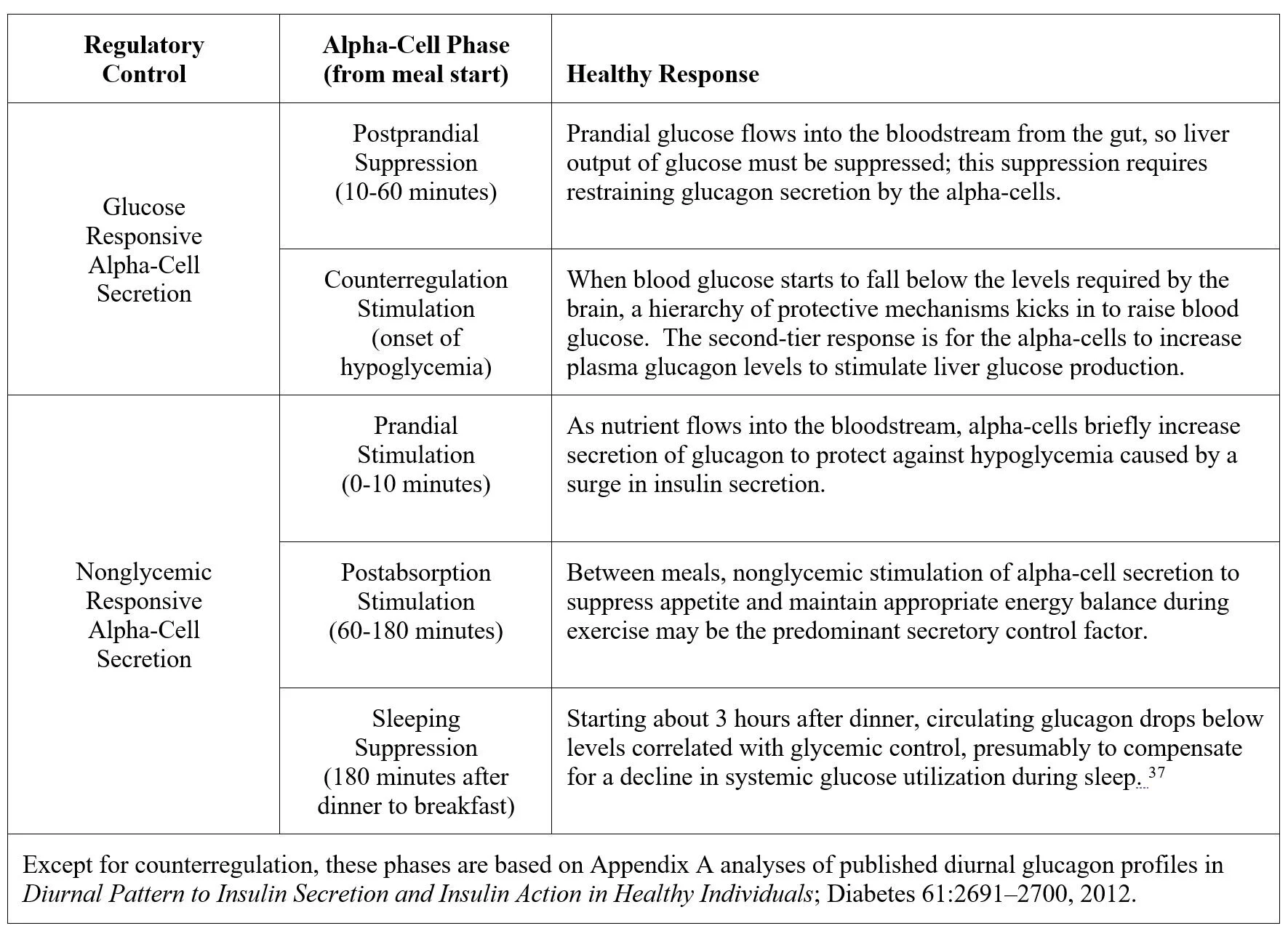 Note: In this discussion of alpha-cell regulation we refer to analyses of diurnal and postprandial glucagon profiles applied to data generated by Andy Basu’s team at the Mayo Clinic as presented in Appendix A: