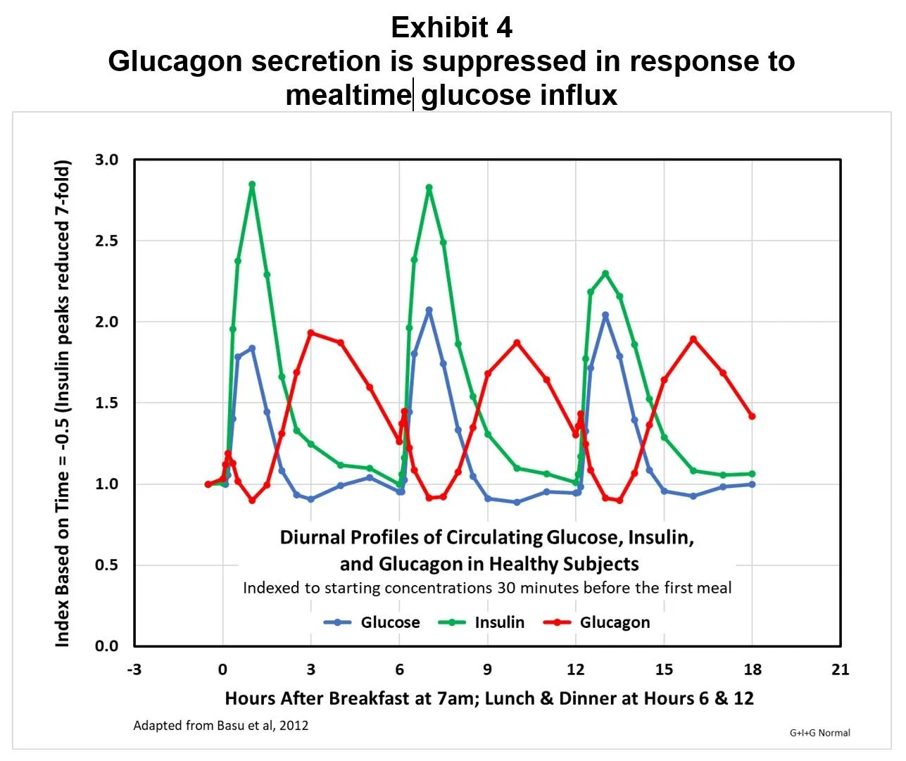 In nondiabetics, following a momentary, arginine-induced spike, prandial increases in circulating glucose cause immediate reductions in circulating glucagon. Exhibit 4 demonstrates this by showing for healthy, nondiabetic subjects glucose, insulin, and glucagon diurnal profiles indexed to preprandial basal levels, with the insulin index divided by seven to allow visual comparisons; in this study, following the amino-acid induced surge, postprandial circulating glucagon was suppressed to a level about 10% below basal levels.