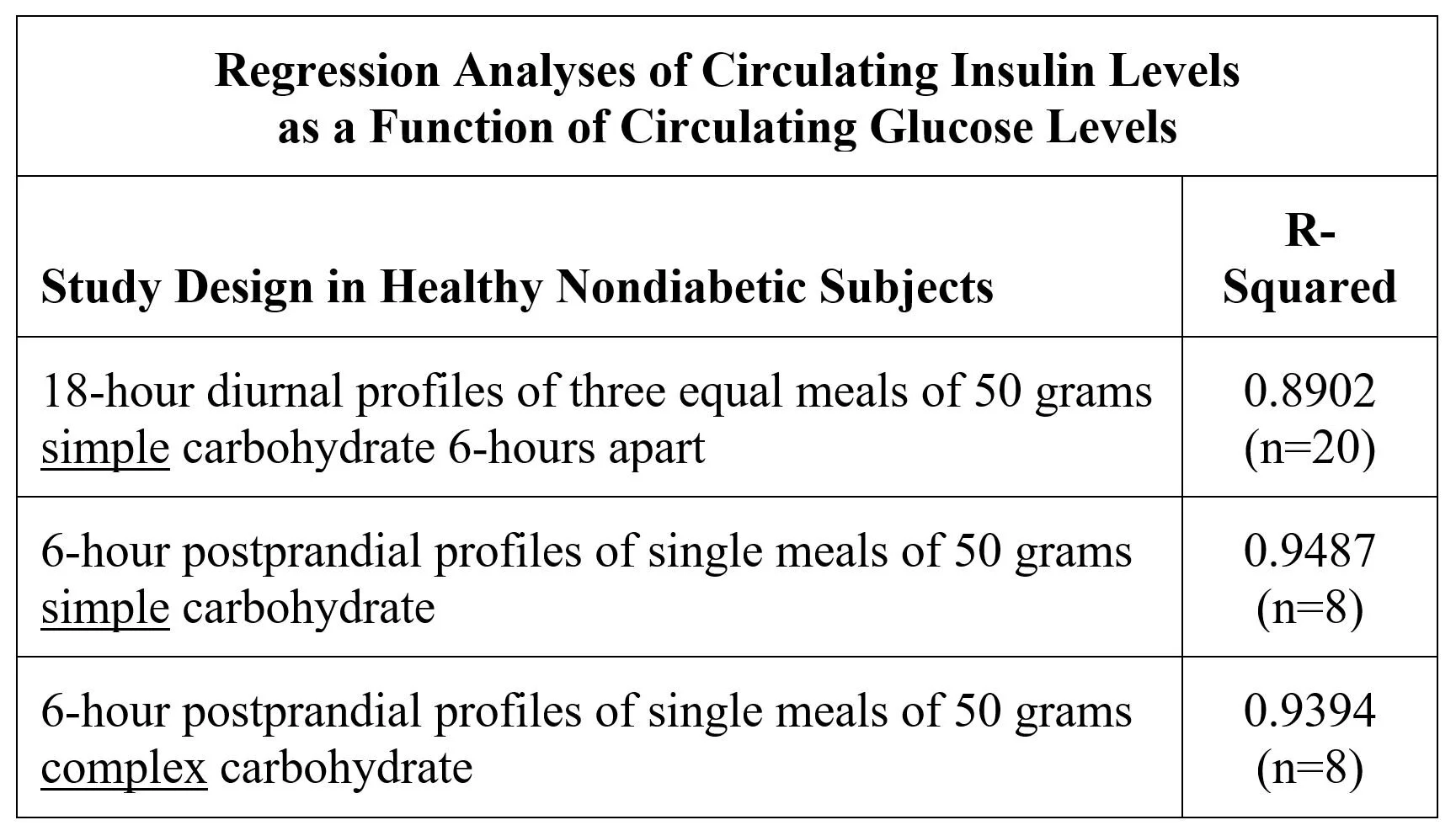 In healthy, nondiabetic subjects, circulating insulin levels are tightly correlated to circulating glucose levels, because beta-cell secretion is mostly responsive to glucose. Linear regression analysis of three different studies confirms that 90%+ of insulin diurnal profiles are explained by glucose profiles: