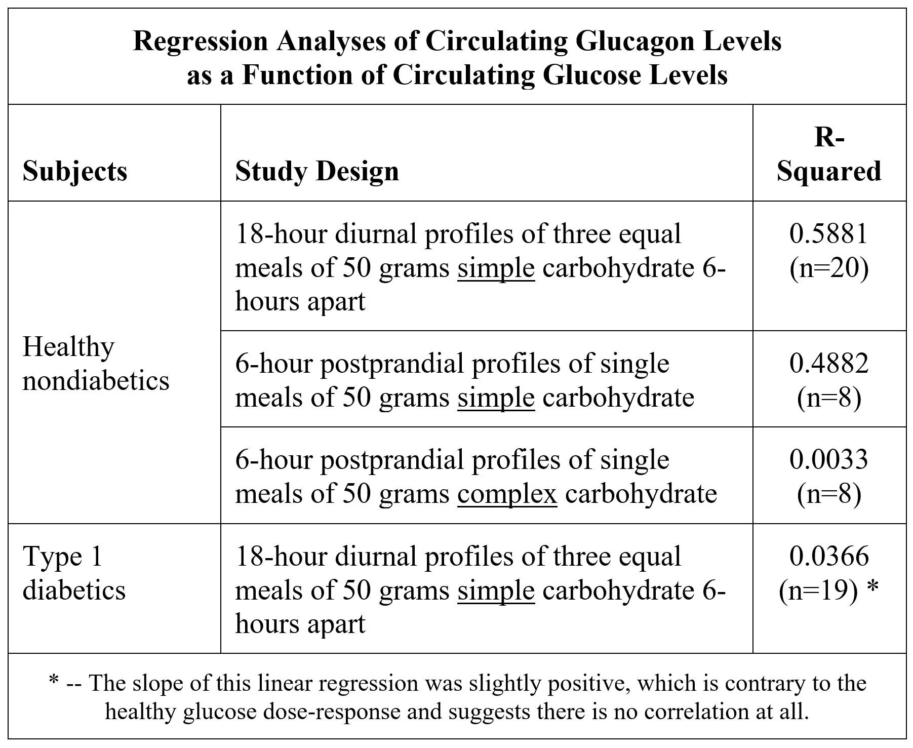 In contrast, circulating glucagon is much less closely correlated with circulating glucose following ingestion of simple carbohydrate, and not at all correlated to glucose following complex carbohydrate and in T1D: