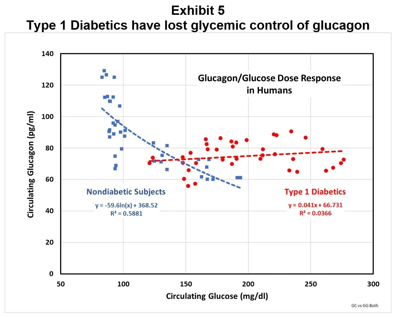 It’s clear from Exhibit 5 that T1D subjects have circulating glucagon levels mostly well above the levels predicted by their chronic hyperglycemia, based on the nondiabetic dose-response. If the T1D diurnal glucose profiles are used in the nondiabetic correlation equation to predict circulating glucagon, the resulting area under the curve compared to actual T1D levels indicates that T1D subjects are exposed to 35% more circulating glucagon than they should be, i.e. they are relatively hyperglucagonemic.
