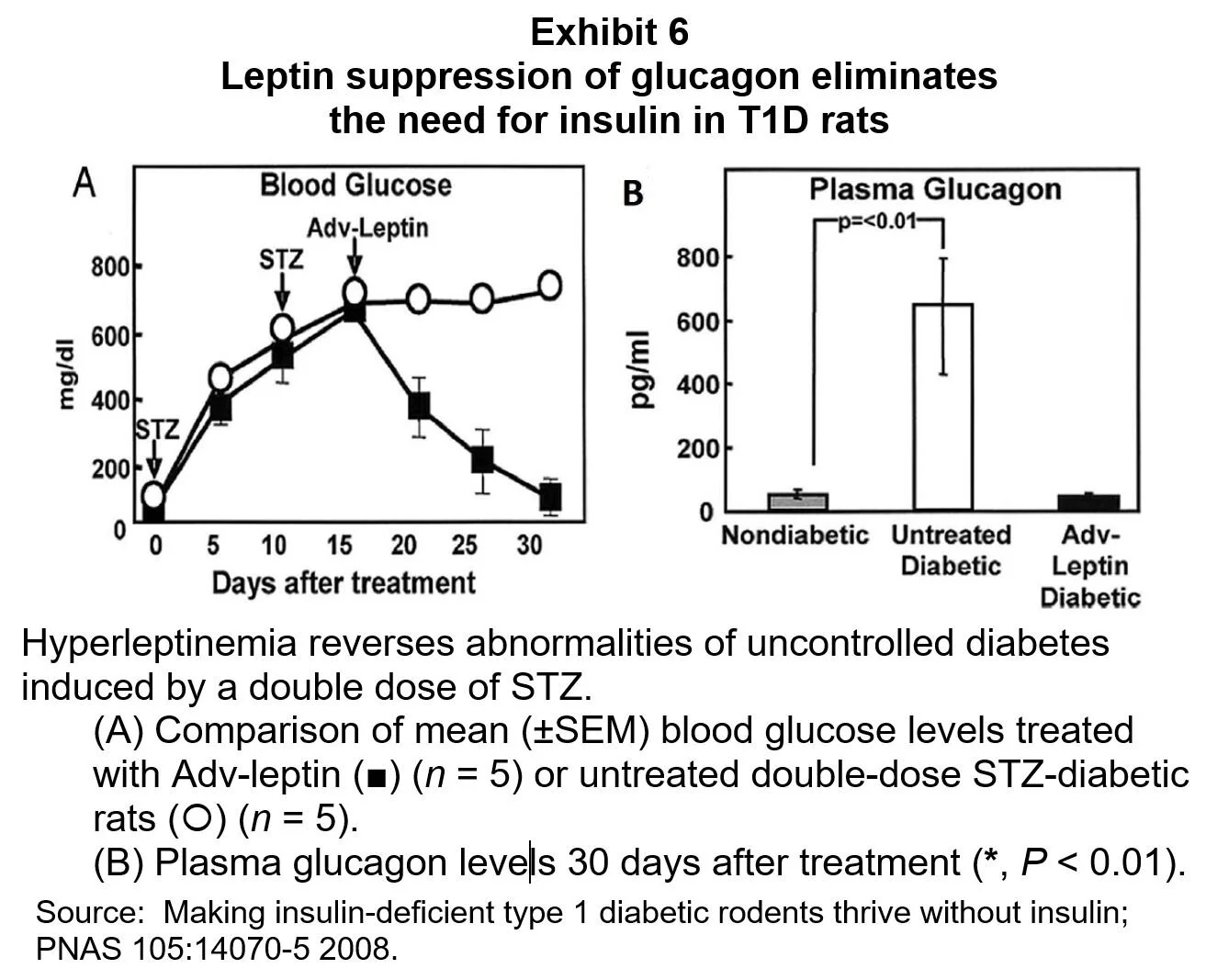 Since glucagon stimulates hepatic glucose production, an excess of glucagon can be expected to contribute to the chronic hyperglycemia of T1D. This is supported by a T1D animal experiment in which correcting the excessive glucagon secretion virtually eliminated the need for insulin. [8] In this experiment plasma glucose was normalized in diabetic rats given leptin to suppress their secretion of glucagon; results are shown in Exhibit 6.