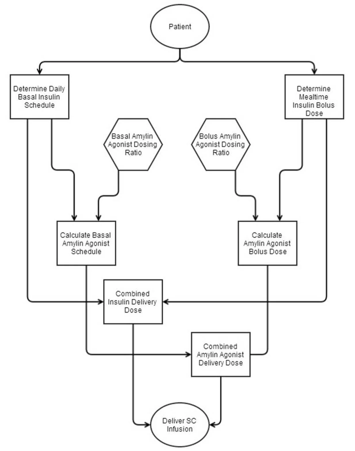 1. A medical infusion pump system for delivering an insulin and an amylin agonist analog to a patient, said system comprising a user interface, an insulin drug reservoir, an amylin agonist analog drug reservoir, and independent pumping mechanisms for said drug reservoirs, wherein said pumping mechanisms can be regulated by the patient and/or one or more computer algorithms via a processor that (a) sets the basal and bolus rates of insulin infusion to stabilize glucose levels and (b) calculates the basal and bolus rates of amylin agonist analog infusion in ratios to said basal and bolus insulin infusion rates, wherein the amylin agonist analog/insulin basal ratio is different from and higher than the amylin agonist analog/insulin bolus ratio.