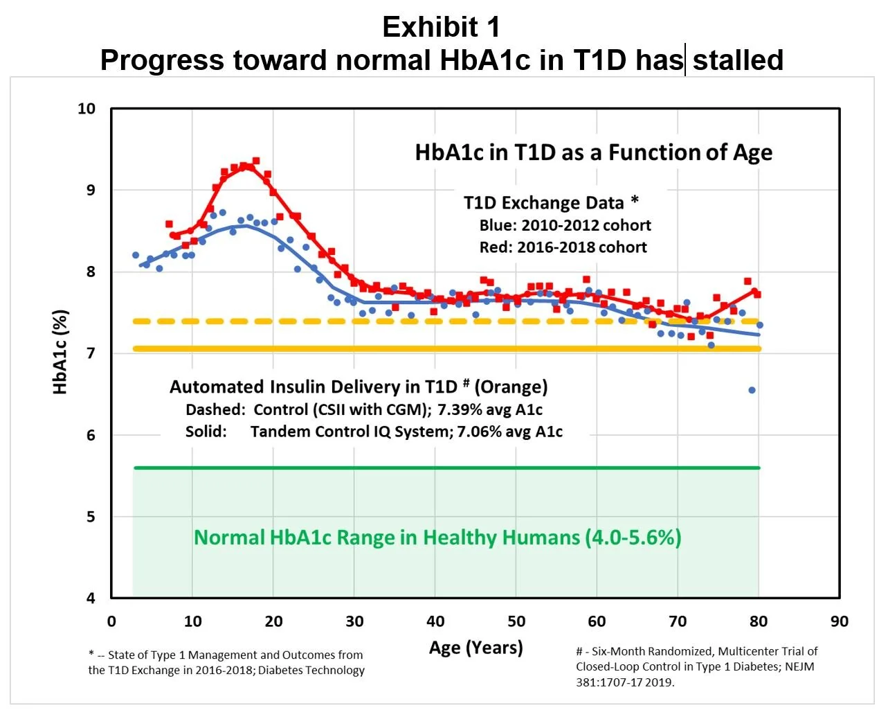 This failure to achieve euglycemia in T1D has serious consequences: a 2015 study estimated that the loss of life expectancy from age 20 for a T1D patient is 11-13 years. [4] Clearly the number one goal in treating T1D is to permit patients to achieve HbA1c levels in the normal, healthy range.