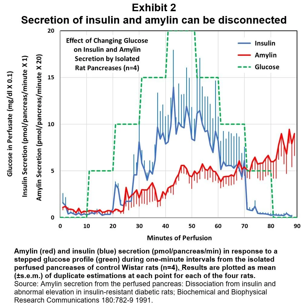 One study of perfused rat pancreases looked at the time course of insulin and amylin secretion when stimulated by stepwise rising and falling levels of perfusate glucose. [9] For normal, non-diabetic rats, insulin secretion closely tracked glucose concentration, while amylin displayed a slowly rising secretion rate (Exhibit 2).
