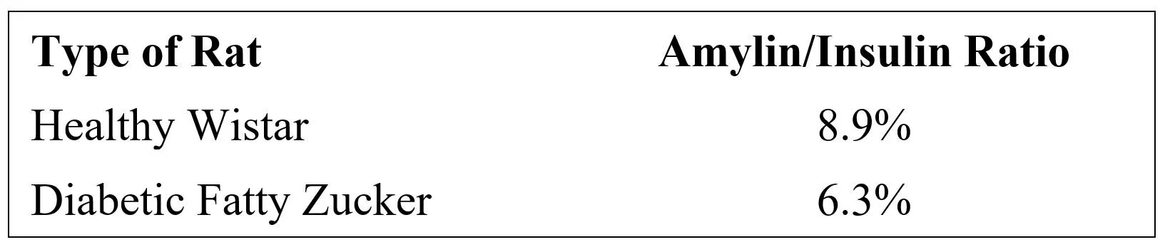 These different rates of response to rising blood glucose would act to vary the prandial peaks of insulin relative to those of amylin as a function of meal size. This study also demonstrated that amylin/insulin molar secretion ratios were different in diabetic rats compared to healthy, control rats: