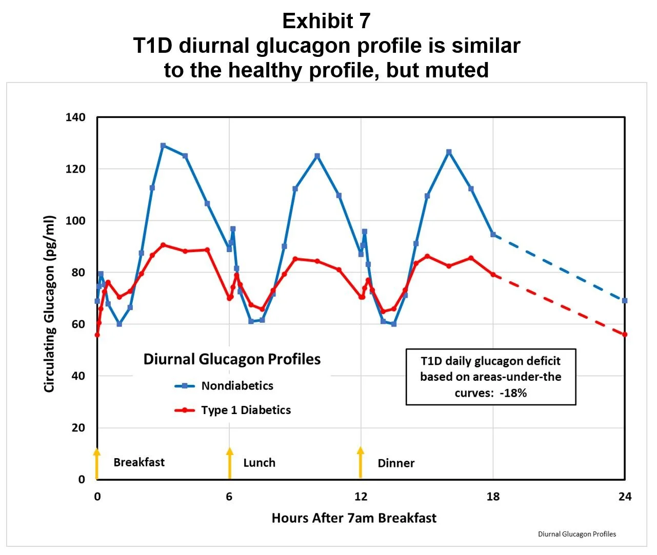 As shown in Exhibit 7, while the amplitude of the T1D diurnal glucagon profile is muted compared to the nondiabetic profile, the T1D pattern is similar.