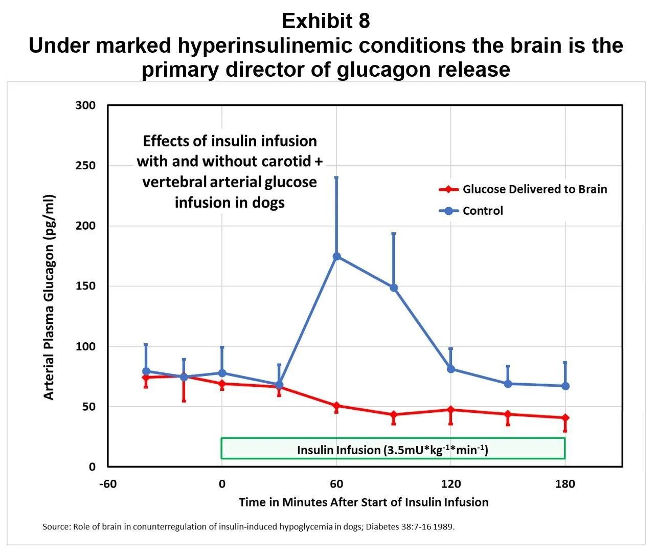 “These results suggest that under marked hyperinsulinemic conditions the brain is the primary director of glucagon release and that it is responsible for ~75% of the life-sustaining glucose production.” [18]